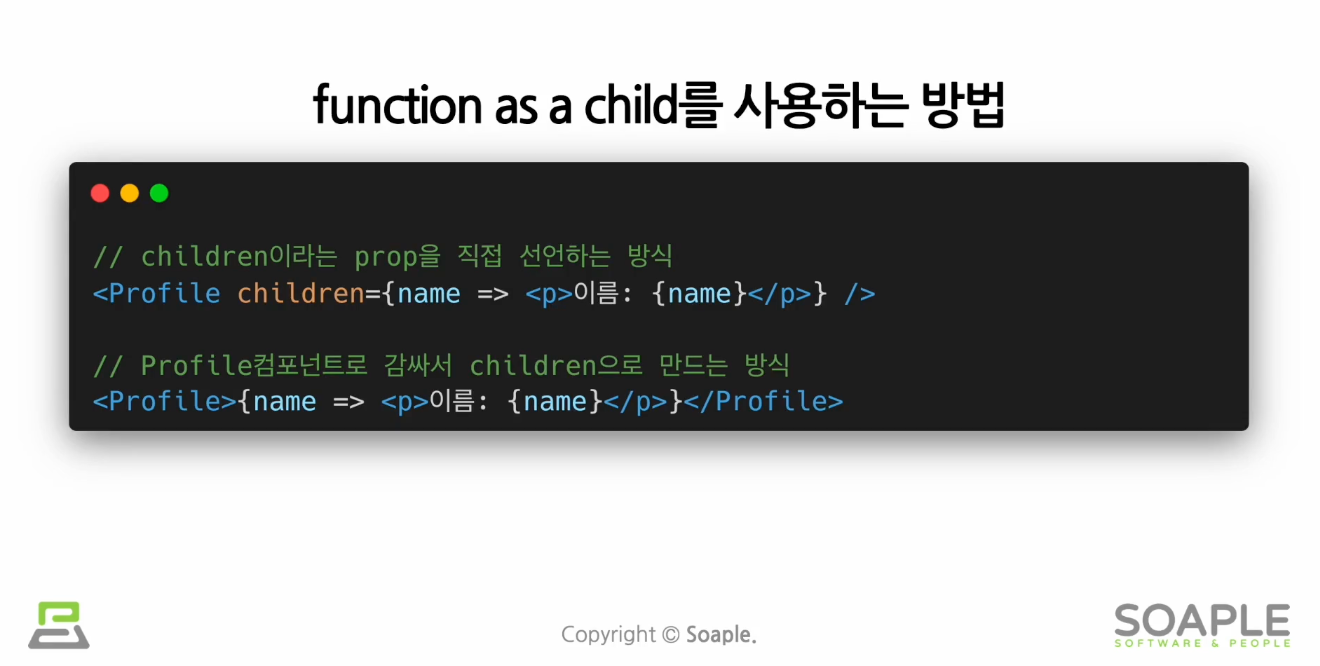 function as a child : 컴포넌트의 자식으로 함수를 사용하는 방법. React에서는 하위 컴포넌트를 child 이란 props로 전달하는데 함수를 사용하려면 이렇게 써야한다.