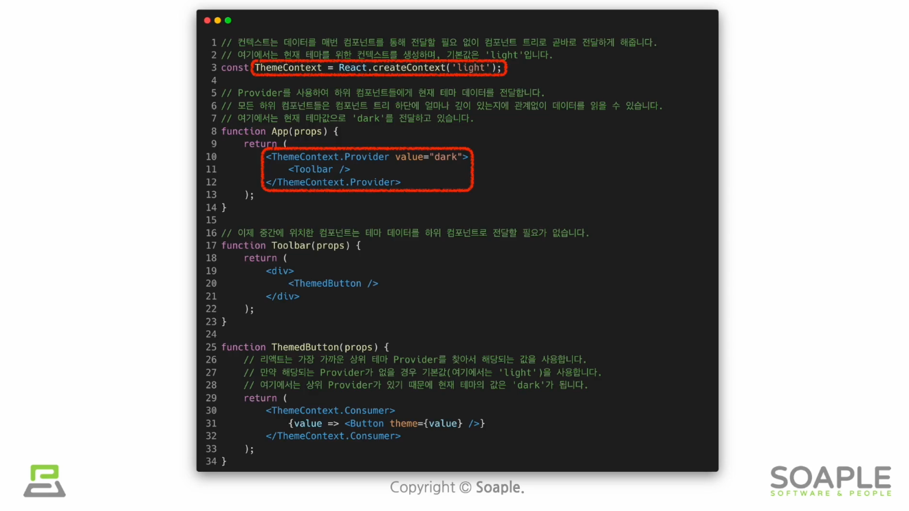 ThemeContext를 생성, Provider로 감싸주어야하는데,
