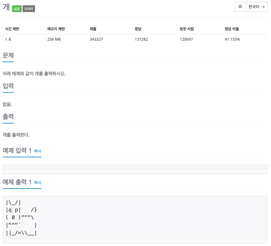 문제 아래 예제와 같이 개를 출력하시오. 입력 출력 예제 입력 1 복사 예제 출력 1 복사 |\_/| |q p| /} ( 0 )"""\ |"^"` | ||_/=\\__|...