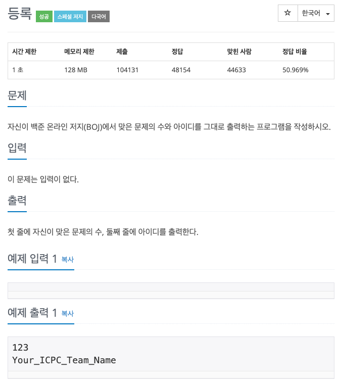 자신이 백준 온라인 저지(BOJ)에서 맞은 문제의 수와 아이디를 그대로 출력하는 프로그램을 작성하시오.