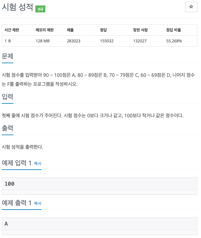 시험 점수를 입력받아 90 ~ 100점은 A, 80 ~ 89점은 B, 70 ~ 79점은 C, 60 ~ 69점은 D, 나머지 점수는 F를 출력하는 프로그램을 작성하시오.